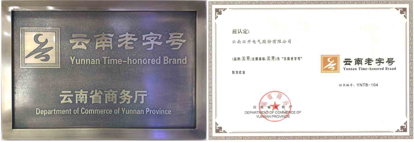 2021年2月4日,云南云开电气股份有限公司(品牌:云开 注册商标:云开)被云南省商务厅授予云南省第六批 “云南老字号”,并颁发牌匾证书。
