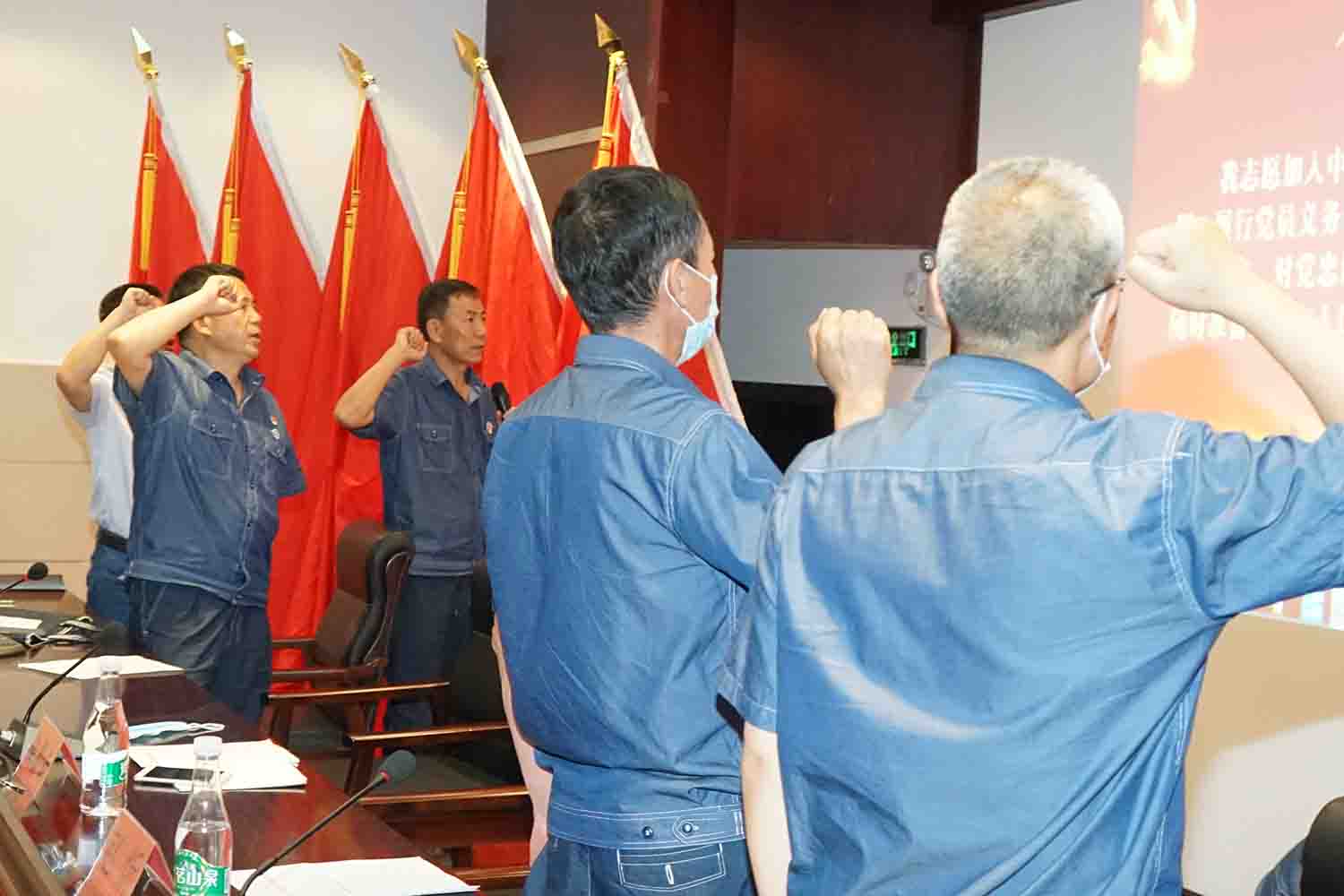 会议首先进行重温入党誓词。现场气氛庄严,党委书记伍昌云同志领誓,全体共产党员重温誓词。
